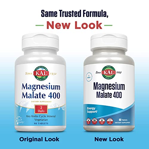 Details: ”Malate was the form of magnesium I was looking for because it absorbs well without the laxative effect of some of the other forms. This brand has a good reputation...” Formulated to help support energy production, KAL Magnesium Malate has become a favorite magnesium for people from all walks of life. Magnesium is involved in over 300 enzymatic reactions in the body and supports normal, healthy muscle function. Nothing is quite as unnerving as not knowing where your supplements come from or how they were made. KAL controls its supplement creation process from start to finish. Produced in our very own facility, KAL Magnesium Malate is made by reacting the mineral Magnesium with Malic Acid. Malate is a key nutrient in the Krebs cycle. This meticulous process produces Magnesium of the greatest quality, chelated and highly bioavailable. KAL Magnesium Malate 400 tablets provide 400 mg Magnesium per serving (2 capsules). Our one-of-a-kind ActivTab™ technology guarantees tablet disintegration within 30 minutes according to USP standards. The unique science helps make KAL Magnesium easier to take as compared to other magnesium supplements. This means that you get all of the health benefits you need without some of the nasty effects you don’t want. The KAL brand has been making the right supplements with the right ingredients – nothing more, nothing less – for more than 85 years. Since 1932, we’ve searched the world for the highest-quality nutrients to help support our customers’ health and wellness. Using leading nutritional research as our constant guide, our evidence-based approach creates loyal customers who find what they need from a brand they trust to offer the very best. Trust KAL to deliver the magnesium you’ve been looking for – get KAL Magnesium Malate 400 today!